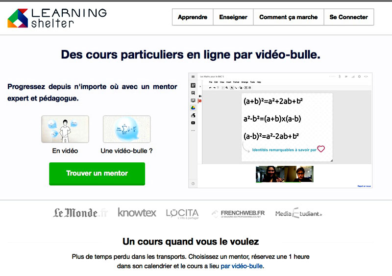Lancée fin 2012 par 3 étudiants, LearningShelter se présente comme « le premier site en France de cours particuliers en ligne par vidéo-bulle ». Concrètement, LearningShelter propose de mettre en relation des élèves avec des profs, (des « mentors » selon leur vocabulaire), pour prendre un cours particulier en ligne, via Hangout. Et les premiers résultats sont plutôt encourageants : en quelques mois d'existence, la plateforme a déjà réuni 150 mentors auxquels plus de 10 000 euros ont été reversés.